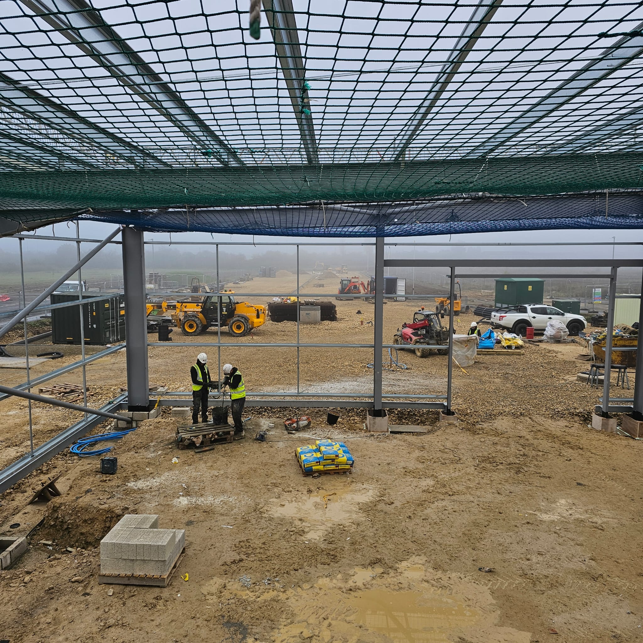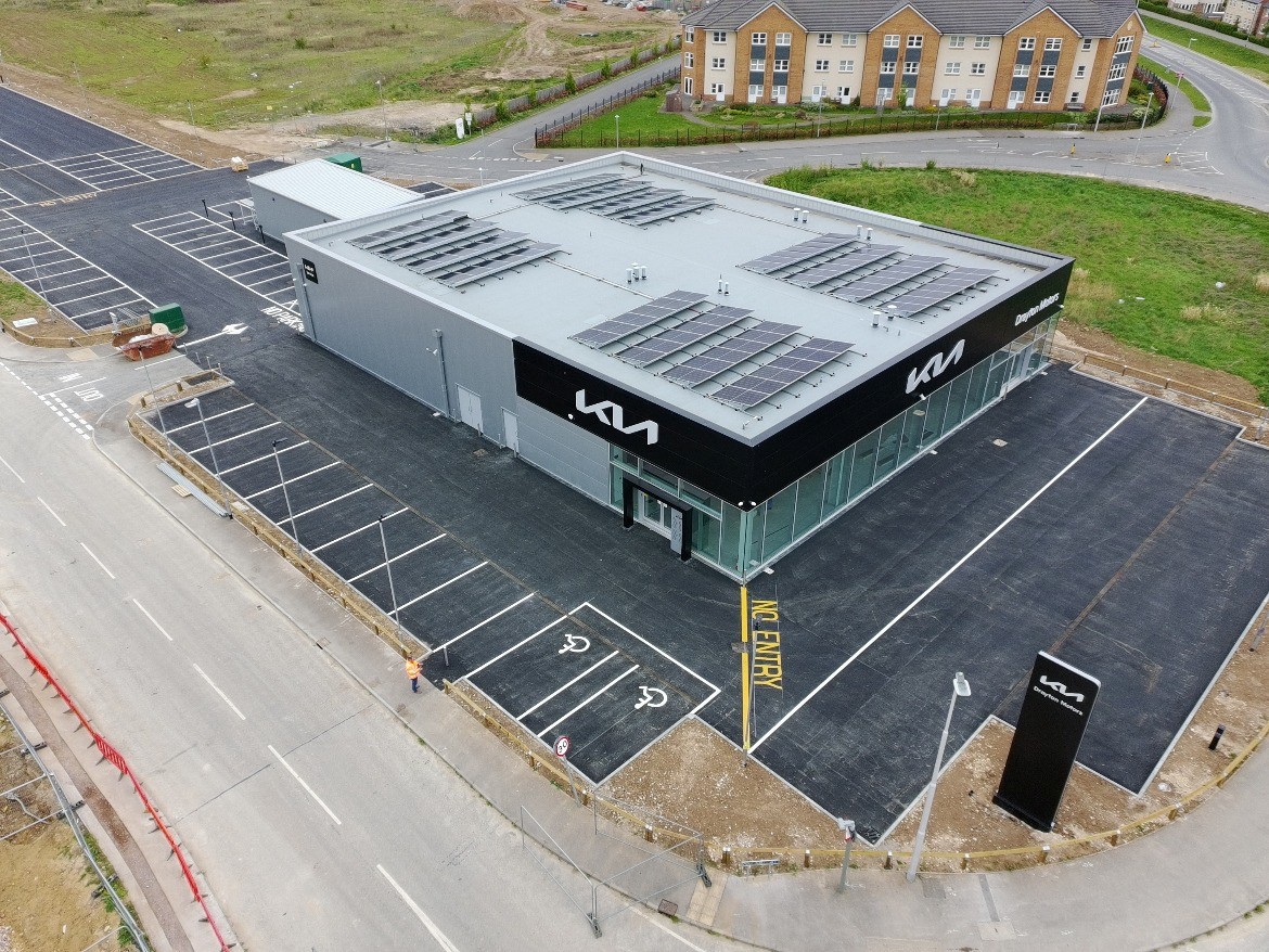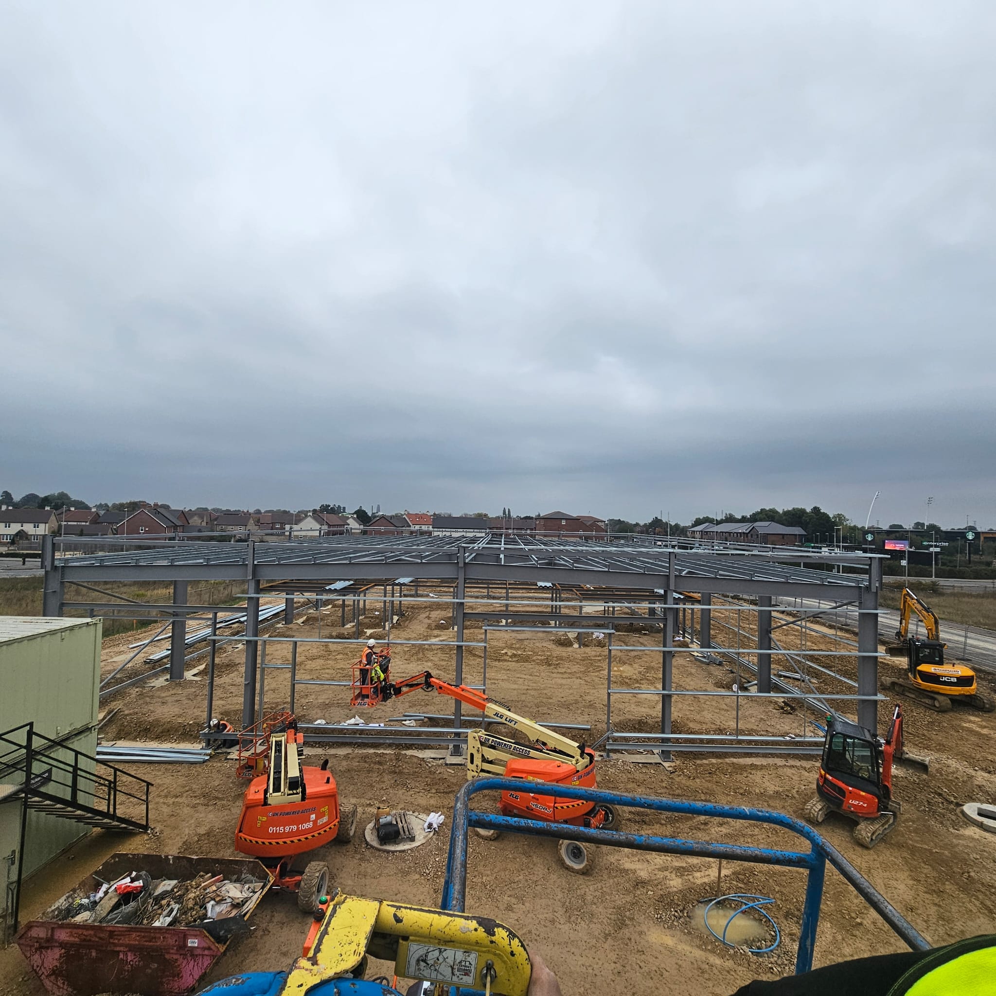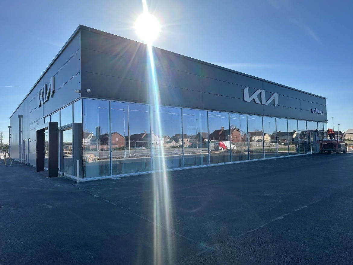 Fully front glazed portal frame showroom, with internal office mezzanine space and workshop to the rear. Challenges included ground that needed improving for the ground floor slab, along with piled foundations to reach natural ground. There is a large car park area with challenging levels and drainage areas to overcome.