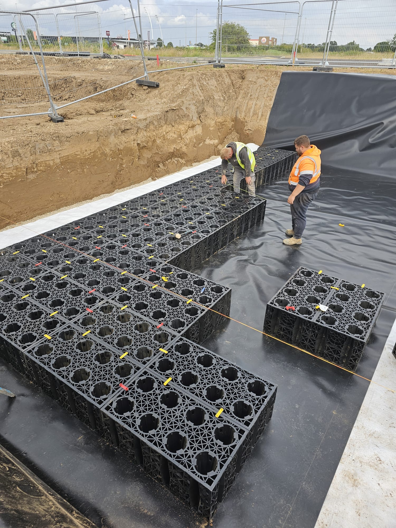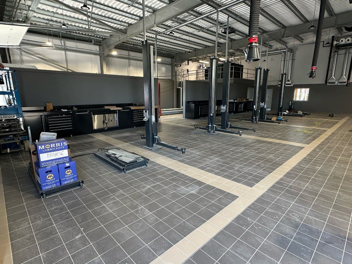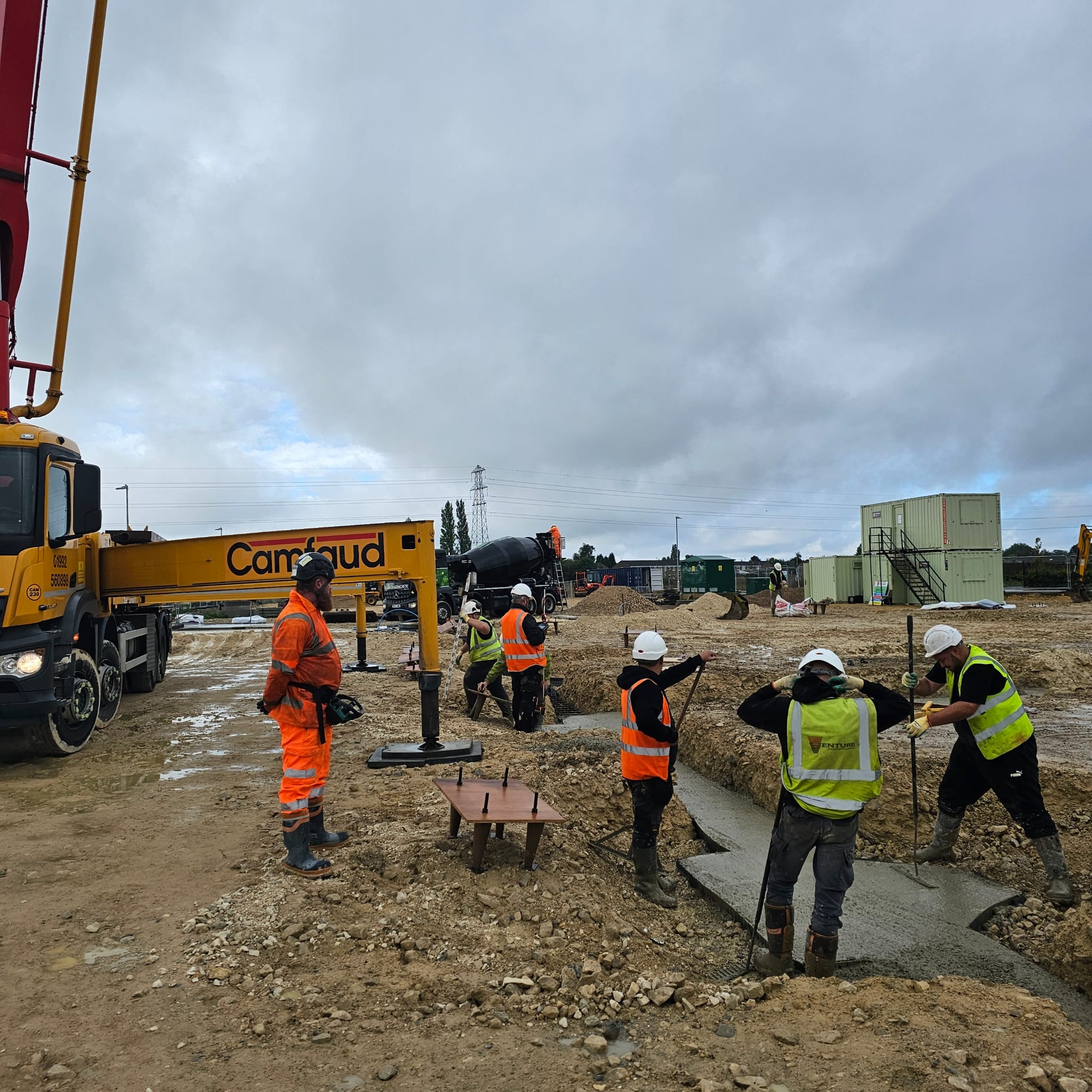 Fully front glazed portal frame showroom, with internal office mezzanine space and workshop to the rear. Challenges included ground that needed improving for the ground floor slab, along with piled foundations to reach natural ground. There is a large car park area with challenging levels and drainage areas to overcome.