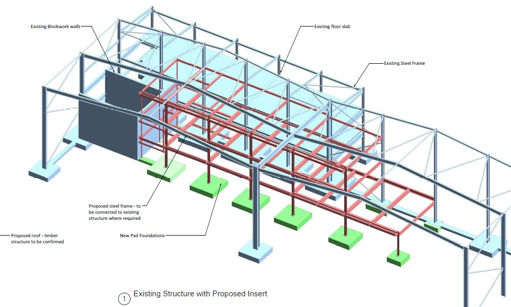 Refurbishment of existing three storey office accommodation and three storey extension to office facilities within an existing Warehouse building. Composite concrete and steel framed design with new foundations formed through an existing industrial building.